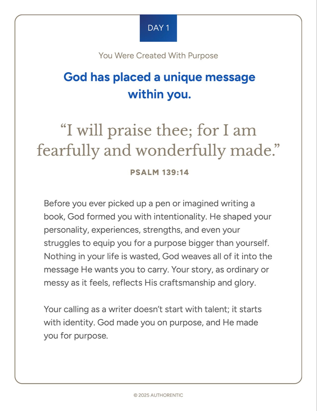 Find the courage, clarity, and spiritual focus you need to write the book God put in your heart. Every day gives you a simple theme, a key Scripture, a short devotional, and a reflection question.